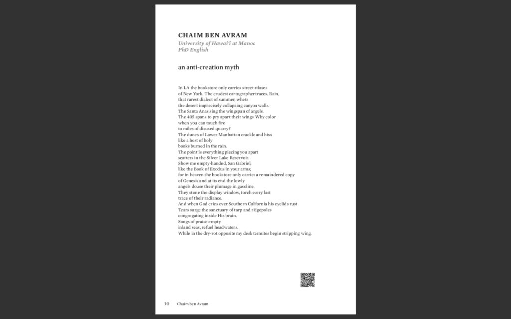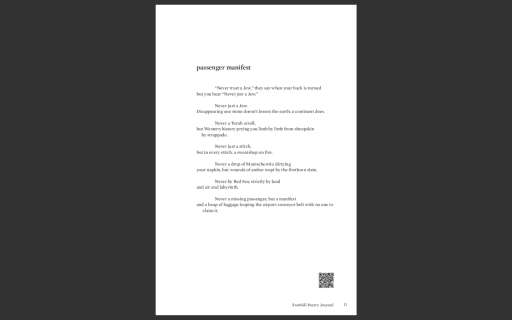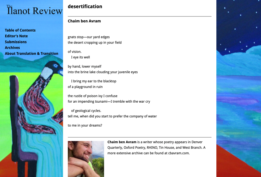 I feel incredibly fortunate to share this poetry, as it came to be through my experimenting with Hebrew. And to have found it a home in Ilanot Review’s “Translation and Transition” issue inspires joy and awe.